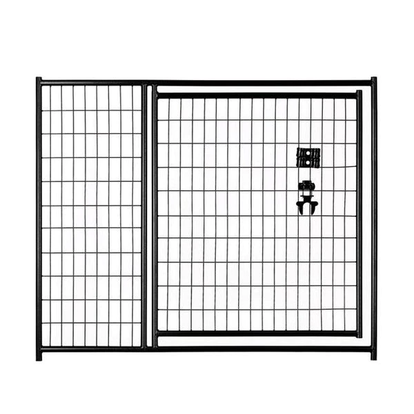 Black Welded Wire Gate Lucky Dog Modular Panels are pre-fabricated. making set-up quick and easy. The modular design provides extra versatility for customizing your layout. Provide your pet and companion with plenty of exercise space using our panels & gates. Simply stand panels upright in desired configuration and bolt together. 2" x 4" mesh size 8-gauge mesh is welded directly to the 100% commercial grade tubular steel frame. Our panels are fully welded. no loose parts. Square corner design further safeguards your pet from injury. 1" legs on each panel allow kennel installations to be easily cleaned. Two clamps with nuts and bolts per panel are supplied for connecting panels together. Exposed tubing on top of kennel are equipped with pipe plugs.Features100% Commercial Grade Steel1" Extended Legs for easy cleaning2 Panel Clamps & Latch included8 Gauge Heavy Duty 2×4 Welded Wire MeshCenter Weld Process helps to prevent sharp edges2 Step Powder Coating Finish. after weldingOptional Self Tapping screw hole provided in latch bodyLockable. Steel Door LatchModular. Square Corner Tube Frame Panels offer great stability and design flexibilityBlack Powder Coated for a superior lookSpecificationsColor: BlackSize: 4 x 5 ft.