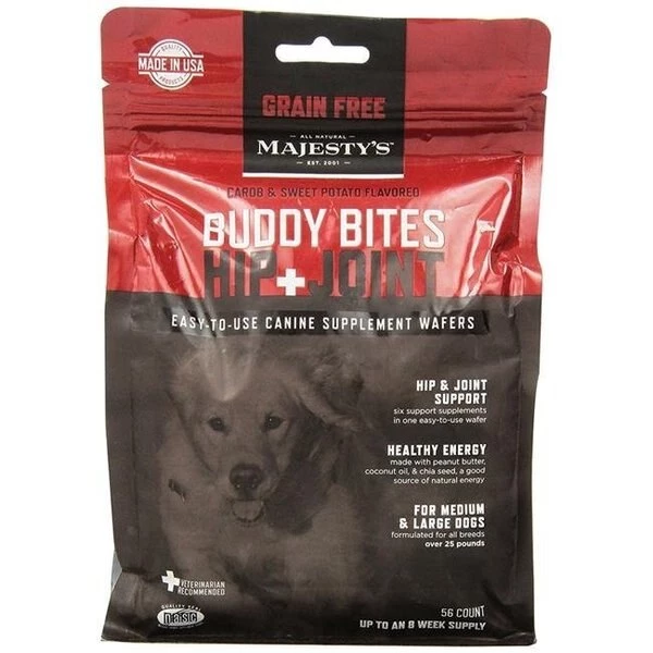 Majesty's buddy bites hip and joint grain-free is a superior joint and bone supplement for your dog. formulated with 6 joint support supplements in one easy-to-use treat. Buddy bites contain high levels of the joint support supplements your dog needs to maintain normal joint function and mobility. 500 Mg glucosamine. 500 mg msm. 250 mg yucca. 120 mg chondroitin. 50 mg vitamin c and 10 mg hyaluronic acid per treat. FeaturesBuddy bites hip & joint. grain free formula carob & sweet potatoSpecificationsProduct Facts: Medium/Large DogCount: 28