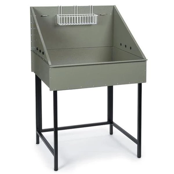 Our premium Master Equipment Everyday Pro Mini Tub is designed specifically for grooming smaller pets. Each tub features three 1 inch diameter plumbing holes (fit for 4 inches or 8 inches faucet hookups). predrilled 3.25 inches drain hole. and two u-shaped backsplash bolts. Shampoo rack included.Basin is made of 16-gauge zinc-plated. powder-coated steel. with a rust-resistant stainless steel bottom panel.Backsplash is 19-gauge steel.Seams are sealed with mold-resistant silicone to provide a long-lasting. watertight seal.The mold-resistant silicone caulking provides a long-lasting. watertight sea.Materials- PU. plastic. 16-gauge zinc-plated. powder-coated steel. with a rust-resistant stainless steel bottom panel.Size- 120 in.Usable length – 10 ft .Hose length- 12 ft (with 15 loops).Parts List-A) Rear Stand (1) .B) Top Stand (1) .C) Stand Sides (2).D) Tub Basin (1) .E) Tub Backsplash (1) .F) Tub Side Splashes (2) .G) Shampoo Rack (1) .H) Hex Bolts (8) .I) Standard Bolts (34) .J) Nuts (34) .K) Silicone Glue Sealant and Gun (1) .Tools needed- Hex Wrench Philips Head Screwdriver Pliers Bolt one side stand (C) to rear stand (A) with two hex bolts (G) repeat for other side of stand.Bolt the top of the stand (B) to assembled sides with two hex bolts (G) repeat for the other side.Lower the tub basin (D) onto the assembled stand. Note- The tub can be positioned so the drain hole is on the left or right.Choose what side of the basin you want the backsplash (E) to be on.Lay a thin line of silicone sealant (K) along the bottom edge of one side splash (C) and side of tub basin (D). Bolt the bottom of one side splash (C) to the tub basin (D). Use a standard bolt (1) and nut (J) in every pre-drilled hole.Lay a thin of silicone sealant (K) along the front sides and the bottom edge of the backsplash (E). Bolt the backsplash (E) to the attached side splash (F) and to the tub basin (D). Use a standard bolt (K) and nut (L) in every pre-drilled hole.Lay a thin line of silicone sealant (K) along the bottom edge of the other side splash (F) and the side of tub basin (D). Bolt the side splash (F) to the tub basin (D) with remaining standard bolts (!) and nuts (J). using one in every hole.The tub basin comes pre-sealed with silicone. For extra leak protection. add another layer of silicone along the seams of the basin prior to use.Remove excess silicone from all seams. making sure the silicone has completely filled the gaps.Hang the shampoo rack (G) onto the back of the backsplash using hooks on the back rack.Adjust leveling feet on the stand to have the drain approximately 1/8 inches lower than the opposite side of the tub. This allows water to drain water.Install plumbing as needed. Faucet holes are 4 inches and 8 inches on center. and the tub takes 3.25 in.