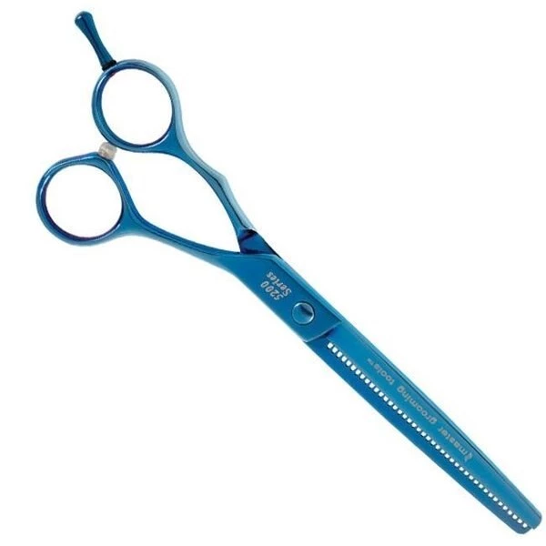 Our Master Grooming Tools Blue Titanium Series Shears offer high performance. remarkable value. and a touch of style. Get a fashionable set of professional grooming shears without sacrificing performance or spending too much! Titanium shears come in our popular blue color.Short shanks and offset handles for reduced hand fatigueRemovable finger rests and silencers for comfortable. quiet operationDialed tension adjusters make it easy to set the cutting tensionBlack leatherette case.Material – 440C Stainless Steel with Titanium Coating.Size – 6.5 in. 42-tooth Thinning Shear.Thinning/ have a lower number of teeth per inch of shear. Thus. the cumulative cutting surface is larger and more hair is removed with one motion. This allows groomers to bulk thin larger areas at one time. These shears are also great for finishing a "natural coated breed" they create that natural look easily.