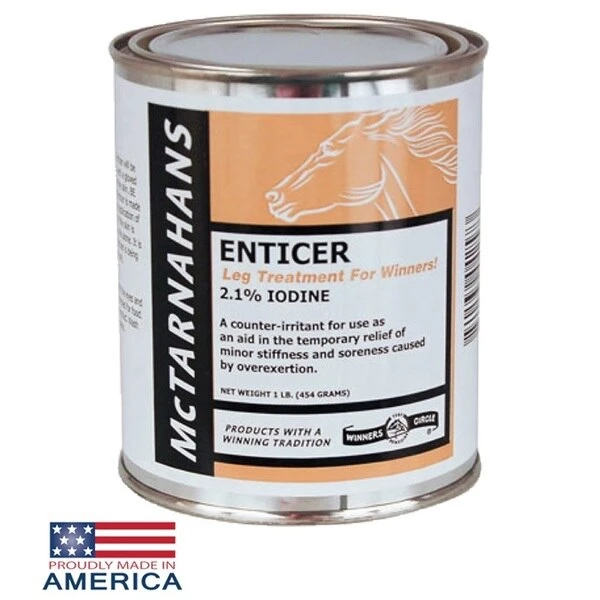 Replaces the former Durecine and compares to Reducine Original Absorbent. A counterirritant for use as an aid in the temporary relief of minor stiffness and soreness caused by overexertion. Directions: Stir well before use. Clip hair from area where Enticer will be applied and then frugally apply by rubbing in with a gloved hand or small stiff brush being careful not to over apply. Application of Enticer is made easier by warming prior to use. Continue daily application of Enticer until blistering, cracking or scaling of the skin is noticed and then cease applying and leave the site alone. It is best to continue exercising the horse while Enticer is being used. Does not leave a permanent mark.Active Ingredients: 2.1% IodineInactive Ingredients: Pine Tar, Glycerin, Kaolin, Potassium Iodide, and Deionized Water. MADE IN AMERICA.
