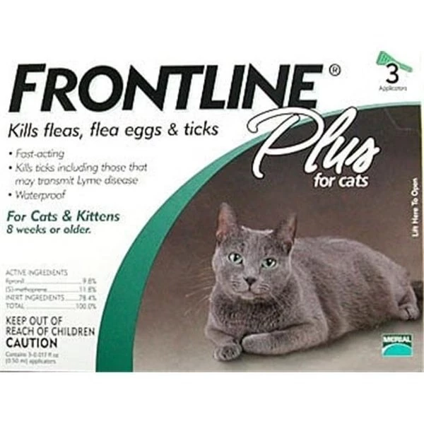 Frontline Plus (OTC)Frontline Plus is a monthly topical flea and tick preventative for dogs and cats. Frontline Plus kills 100 percent of adult fleas on your pet within 18 hours and 100 percent of all ticks within 48 hours. Frontline Plus contains an insect growth regulator S-methoprene which kills flea eggs and larvae. Its effective against all stages of the brown dog tick the American dog tick the lone-star tick and the deer tick (the major carrier of Lyme disease). Frontline Plus remains waterproof for 30 days. Frontline Plus 3 Packs Cat All Sizes – Green