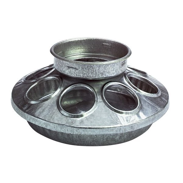 This baby chick feeder screws onto a Little Giant 1 quart plastic screw-on feeder or waterer jar or a standard mason jar to make a gravity feeder. Made of heavy-gauge galvanized steel for years of service. Rounded embossed edges help reduce chafing on chicks' neck and head. Eight feeding holes. 6 inch diameter by 2.5 inch high.