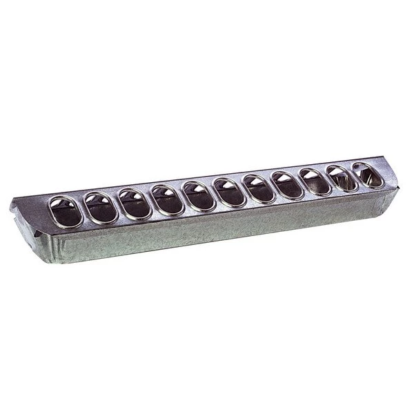 Classic feeder for adult chickens and other birds with 14 feeding holes (7 on each side). Covered top helps keep debris out of the feed while individual holes minimize waste. Top slides off for easy filling and cleaning. Made of heavy-gauge galvanized steel for years of service with rolled edges for safety. Measures 12.5 inch long by 3.875 inch wide by 2.75 inch high.