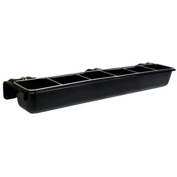 Ideal feeder for goats. sheep. alpacas. and llamas and in creep pens or when feeding multiple animals together. Unique design helps reduce feed waste while promoting animal safety and improved health. Galvanized steel grid forms six feeding slots;; helps keep boss animals from pushing others out while eating. The grid also adds strength to the feeder. and its reinforced hooks provide extra support on the ends. Made of tough. impact-resistant. high-density polyethylene which protects against warpage. stress cracks. and UV damage. Universal secure mounting on any 2-by-wide board or wire livestock panels makes this a great indoor/outdoor trough for barns. yards. and show pens. Mounting hardware included. light assembly with screwdriver required. FeaturesMiller hookover goat troughSpecificationsColor: BlackCapacity: 9 qt.Dimension: 4.72" x 8.44" x 37.75"