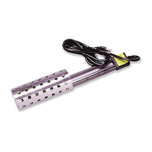 This portable electric water heater is reliable and energy efficient. It is uniquely designed to heat water as opposed to de-icing water. The heater, while immersed in water, will heat continuously past 150 degrees. Each unit comes with a stainless steel guard and an automatic shut off switch. 1000 watt.