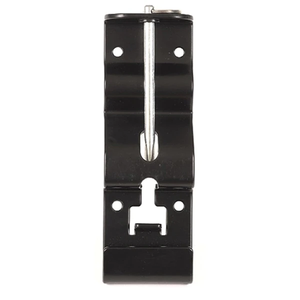 Metal Wall Bracket securely mounts to a wall or fence post and fits most 8 quart to 22 quart flat backed buckets. The pin locks bucket handle in two adjustable tip-free positions. Made of heavy gauge steel with black powder coating finish.