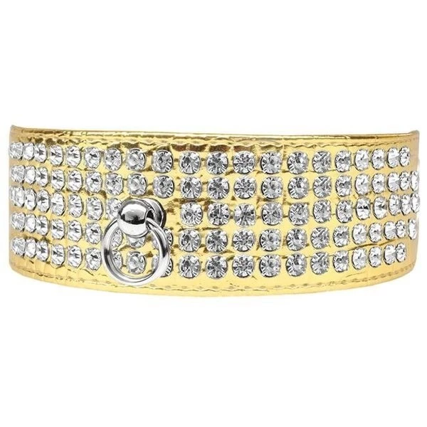 Wide crystal collar with glistening rows of prong set rhinestones. Your pet will shine. The wide collar tapers down to near the buckle for added comfort. Collar has a center post for a pet. FeaturesWide crystal collar with glistening rows of prong set rhinestonesYour pet will shineThe wide collar tapers down to near the buckle for added comfortSpecificationsSize: 18Color: Gold