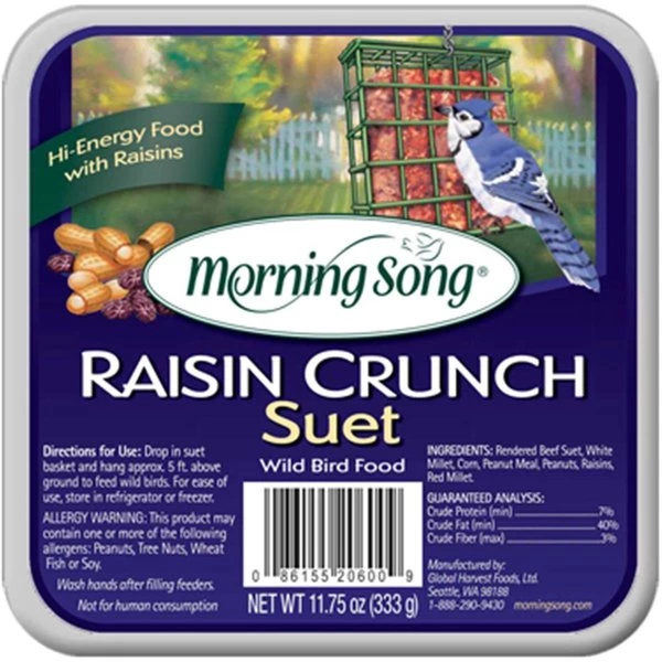 11.75 oz Raisin Crunch Suet Wild Bird FoodTo have a pet at the home requires a lot of passion, care and love. Our Pet Supplies items consist of high quality selection of pets daily needs and everything concerning for your beloved furry pals. Ingredients:Rendered beef suet, white millet, corn, peanut meal, peanuts, raisins, red millet. Not for human consumption.SpecificationsCapacity: 12-11.75 ozCountry of Origin: USAWeight: 0.75 lbs
