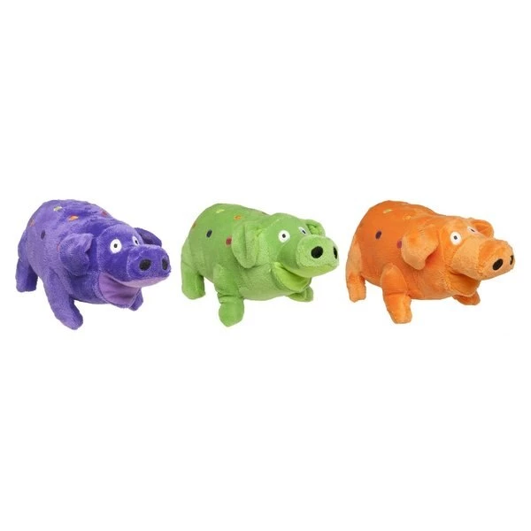 Multipet's Goblet dog toys. These latex polka dot and plush filled pigs Grunt when they are squeezed and ship in assorted colors. Shipper chooses which color is shipped for a nice surprise. This is a great dog toy.