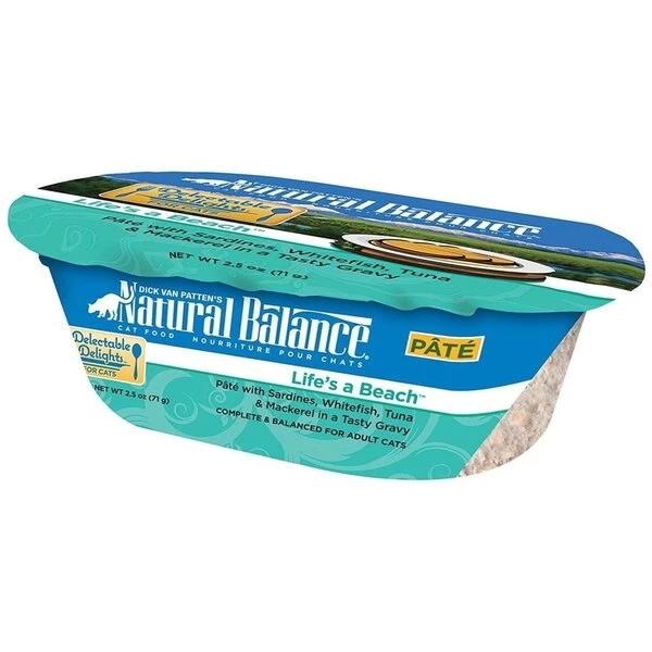 Dick Van Patten's Natural Balance Delectable Delights gourmet cat stews are hand crafted and cooked to savory perfection. Indulge your pet's taste buds! Delectable Delights Life's a Beach is a pate made with Sardines. Whitefish. Tuna & Mackerel in a Tasty Gravy. Complete and balanced for adult cats. FeaturesNatural balance delectable delights life's a beach cat pate tubCase of 12SpecificationsCapacity: 2.5 ozDimension: 3.11" L x 2.13" W x 1.30" DWeight: 6 lbs