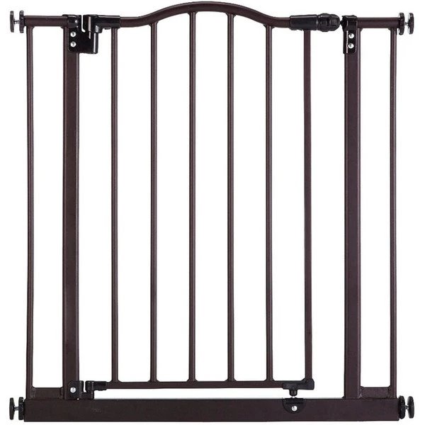 The Windsor Arch Petgate closes firmly yet easily with one simple push keeping your pet contained and your home protected. The exclusive matte bronze finish is designed for exceptional richness durability and depth of color. The arch on the gate adds a touch of style and will complement any home décor while its heavy-duty metal construction is built to last! Gate swings open both ways for added convenience and offer a triple-locking system for peace of mind. To keep the gate open for multiple passes through simply use the hold-open feature to prevent the gate from closing. The gate pressure mounts easily by using tension knobs to secure the gate in place.