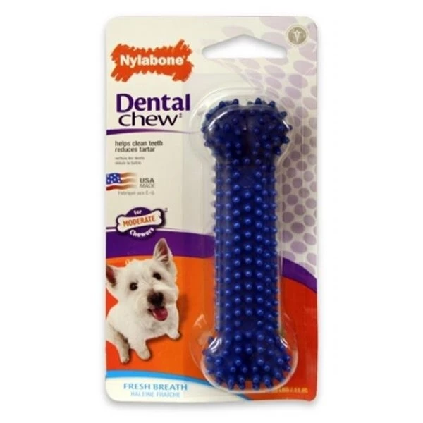 Nylabone Dental Chews are designed to reduce the incidence of periodontal disease in dogs by massaging gums and scraping and cleaning teeth of food particles and tartar. The result is a healthier mouth and fresher breath.The Dental Chew bone has round and pliable dental nubs on all sides. These chews massage the gums and stimulate an increase of healthy fluids and saliva flow in the mouth. Friction against the teeth helps remove food debris and bacteria that leads to calculus formation.Dental Chew bones are designed only for soft and average chewing dogs. Soft chewers normally gnaw at their bones and do not bite them into pieces. If your dog chews off pieces of the bone throw it away and replace the Dental Chew with a larger size.Regular size Dental Chew is for dogs < 25 lbs.These durable chews are flavor-enhanced.The raised dental tips actually attack plaque and tartar buildup.Helps control tartar and plaque.Cleans teeth.Massages gums.Freshens breath.Naturally flavor enhanced.Veterinarian approved.