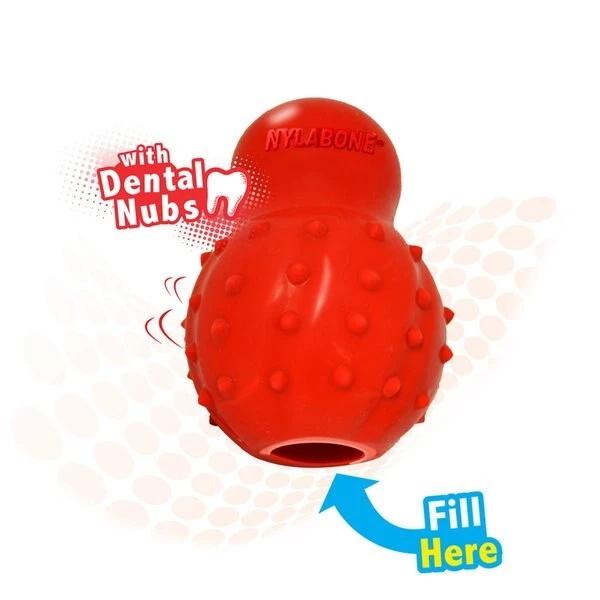 Our Nylabone Busy-Time Stuffable Dog Chew Toy lets dogs chew play and enjoy treats all at the same time! Built to keep dogs busy this stuffable dog chew toy has bacon flavor throughout can be filled with all kinds of dog-friendly edible treats like peanut butter banana pumpkin kibble and yogurt. Whip up your dog’s favorite recipe spoon it into the opening and freeze it for an even longer-lasting dog treat! Its strong rubber surface features raised dental nubs to help clean your dog’s teeth as he chews. A great chew toy for aggressive chewers who prefer some flex and give this cone-shaped chew toy bounces and rolls in all different directions for added excitement. Take your dog's chewing sessions to the next level with this multipurpose rubber dog chew and treat toy!