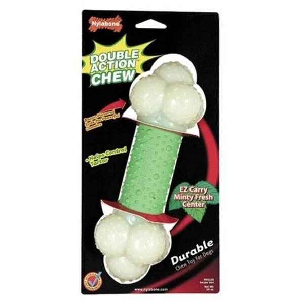 DURA CHEW DOUBLE ACTIONDurable chew for dogs features a soft portion with a minty center for easy carrying.The ends are durable for powerful chewers.The small nubbins gently clean the teeth.Bristle-like projections raised during chewing also help to clean the teeth.UPC : 018214814207Color : MINTSize : SOUPERLength : 2.094Width : 1.375Height : 1.104Product Type : Dog – Toys / RubberShipping Dimensions: 2.094×1.375×1.104