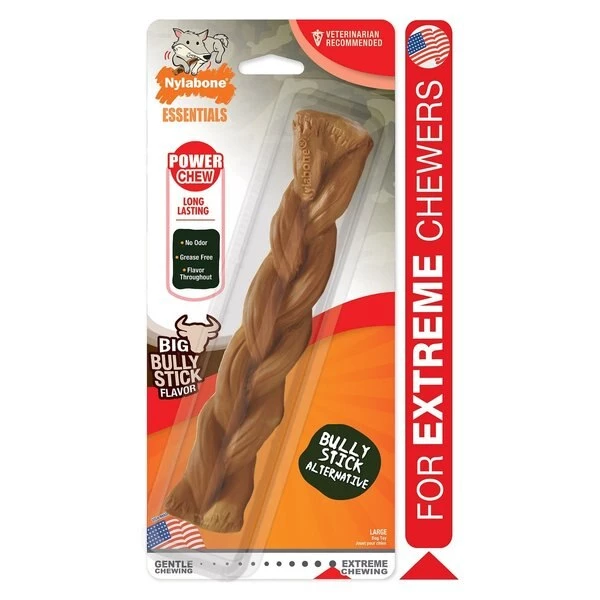For over 60 years Nylabone has been creating dog chew toys in a variety of shapes textures and sizes to satisfy every fur pal. From our unique line of Natural Alternatives this Power Chew Braided Bully Stick Alternative is cleaner and safer than real bully sticks and offers all the same benefits—with no grease or odor. Its authentic braided shape and savory calorie-free bully stick flavor will indulge your dog’s craving for real animal parts. Created just for power chewers this long-lasting dog chew toy is made of durable nylon. It will help discourage destructive chewing satisfy your furry friend's instinctive chewing urge and keep them entertained. Plus this USA-made Power Chew features a subtle textured surface that promotes dog oral health by naturally helping clean teeth and freshen breath as your best friend chews! This large dog chew toy is created for dogs up to 50 pounds.