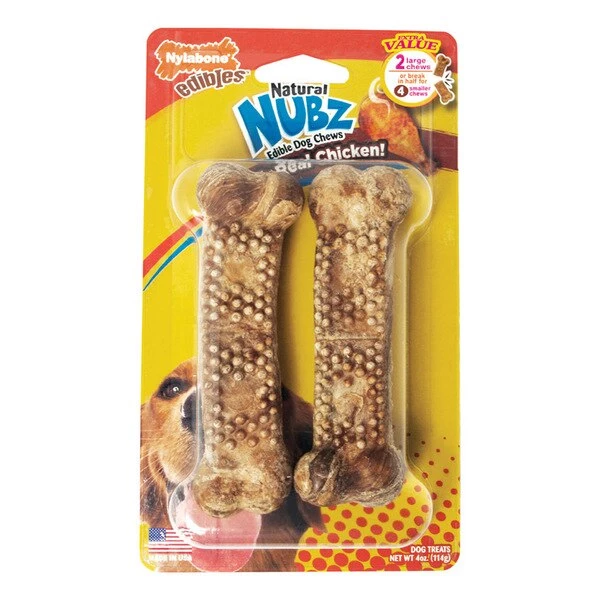 Nylabone Nubz 2 pack large edible chews with real chicken dogs love but none of the artificial colors flavors or preservatives pet parents prefer to keep out of their dog's diet. These highly digestible edible chews also help promote healthy teeth and gums making them a great chew to keep dogs busy between mealtimes.