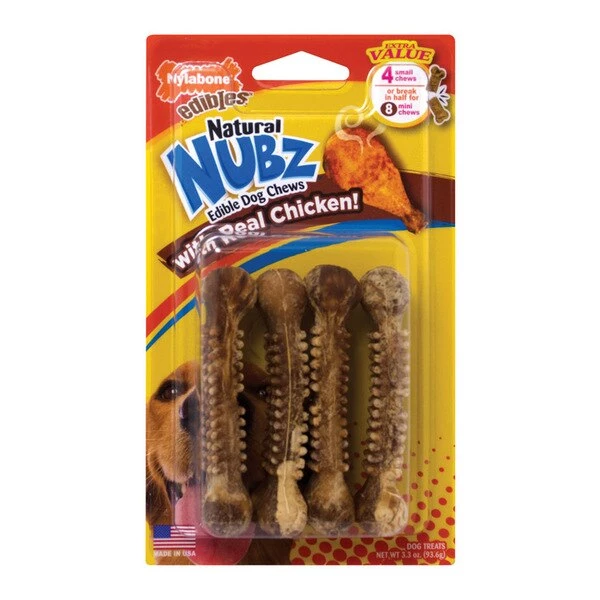 Nylabone Nubz 4 pack small edible chews with real chicken dogs love but none of the artificial colors flavors or preservatives pet parents prefer to keep out of their dog's diet. These highly digestible edible chews also help promote healthy teeth and gums making them a great chew to keep dogs busy between mealtimes.