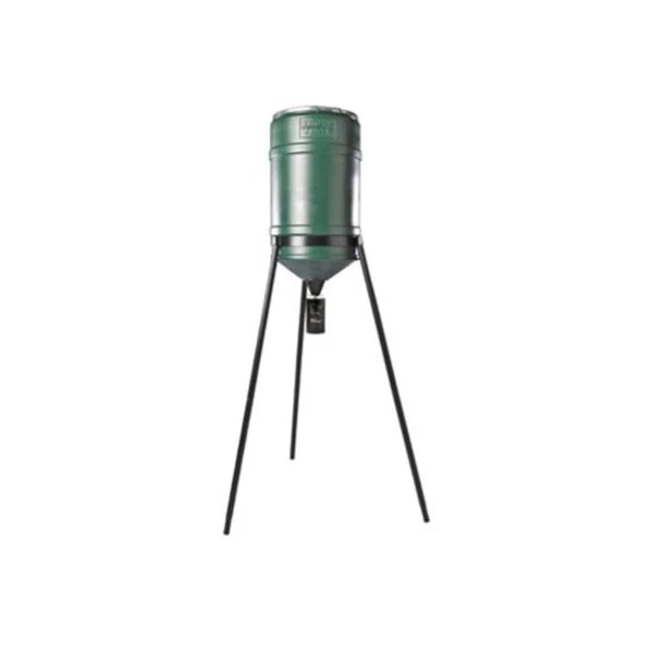 This set-up features a 225-lb. capacity green polyethylene barrel with a quick-release lid. Includes a 2 In wide steel band with 0.75 stubbles for installation of legs. The band uses 1 bolt. Each of the 3 leg segments is constructed of three. 30 In easy-slide-together sections.Everything is packed inside the barrel for easy storage. The Feeder Lifetime Elite Feeder. Constructed of the finest materials. the Elite surpasses military specs and is the most easily programmed feeder on the market today. being so simple you won not need instructions.Its premier features include flawless robotics-built construction. waterproof LCD. customized feedings of 1 to 6 times per day with durations of 1 to 30 seconds. and 3 motor speeds – no additional spin plates are required for distance. Standard plate can throw approximately 25 to 75 feet diameter with different motor speeds.Dimensions – 19 x 19 x 35 In