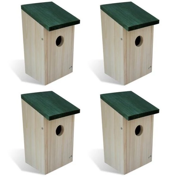 This lovely bird house. constructed of durable pine wood. is designed for a lucky feathered family! It will brighten up your garden and give shelter to your feathered friends. Coming with a green roof and wood color housing. it will also be a perfect ornament as well as a bird nest. Equipped with a metal hanger at the top. it can be hung in your garden. FeaturesMaterial: Solid pine woodTotal size: 5.5" x 6" x 8.7" (L x W x H)Entrance hole: 1.2" in diameter4 PieceSpecificationsWeight: 20 lbs