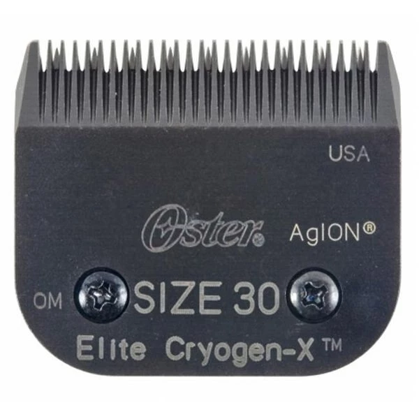 The Oster Elite Cryogen-X Size 30 blade leaves hair 1/50". This blade is used on pet poodles with less sensitive skin or show poodles with sensitive skin conditioned for its use.This blade is used on pet poodles with less sensitive skin or show poodles with sensitive skin conditioned for its use. When this blade is used under an Oster Universal Comb it cuts like a blade.For use with A5 and Cordless Power Pro Clippers.These blades are coated with titanium carbonitride for 3 times longer blade life and smoother cutting. Cutting edge has Rockwell hardness (HRC) of over 80 but are not brittle. The coating will not flake off like regular chrome can.Made in USA.