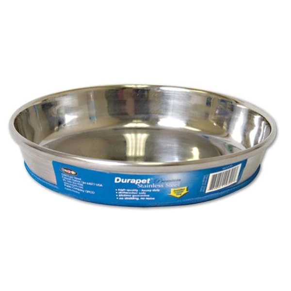 Our Durapet Bowls are one of our most popular items. The 16 oz. is perfect for cats and small breed dogs. This dish features a shallow profile but is made of the same high quality stainless steel as our other bowls. They also feature our patented permanently bonded rubber ring which minimizes floor noise and slippage. Cat dish measures 1.25in deep with a diameter of 6.25in.