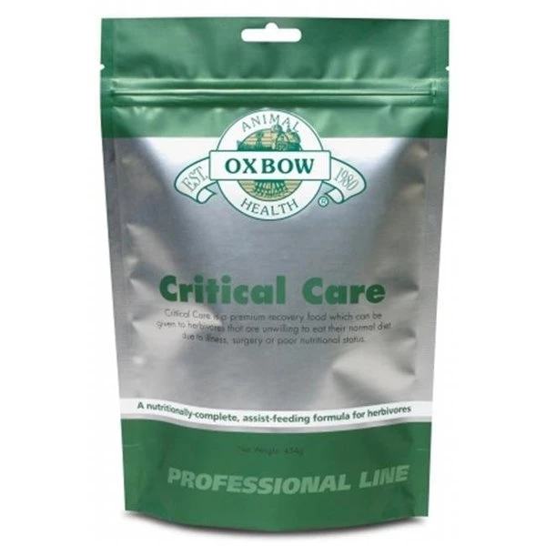 Critical Care is a complete feeding formula for assisted-feeding herbivores that are not eating. Whether an animal's lack of appetite is a result of illness surgery or pain Critical Care plays an important role in the patient's recovery program.Experience has shown that early nutritional support is instrumental in returning sick pet herbivores to full health. Critical Care provides the essential fiber protein energy vitamins and minerals needed to stabilize and hasten the recovery of small exotic animals.Timothy grass hay the main component in Critical Care provides the proper balance of forage-based fiber and soluble carbohydrates needed to support the natural microbial population in teh digestive system.Powdered formula – just add water.Easty to mix one step formula.Designed specifically to support the needs of small herbivores.High in fiber.Low carbohydrates.High digestibility.No added fat or sugars.Stabilized vitamin C.High palatability.Economical.Increases owner compliance.No need to grind pellets.Used for:Anorexia inappetence.Dental disease.Post extraction molar trimming.Severe malocclusions.Post-surgical care.Post spay/neuter.Appetite stimulant.Geriatric patients.Medication carrier.Beneficial for:Rabbits.Guinea pigs.Chinchillas.Degus.Prairie Dogs.Hamsters.Iguanas.Tortoises.Uromastyx.Feeding Directions:Mix one part dry powder to 1.5 parts warm water. Various methods of administration may require more water to be added. Feed 50 cc of mixed product per kilogram of body weight divided between 4-6 feedings per day to any herbivorous mammal or reptile.Refrigerate any unused portion after mixing and use within 24 hours. Best results are achieved when small amounts are mixed at the time of each feeding.