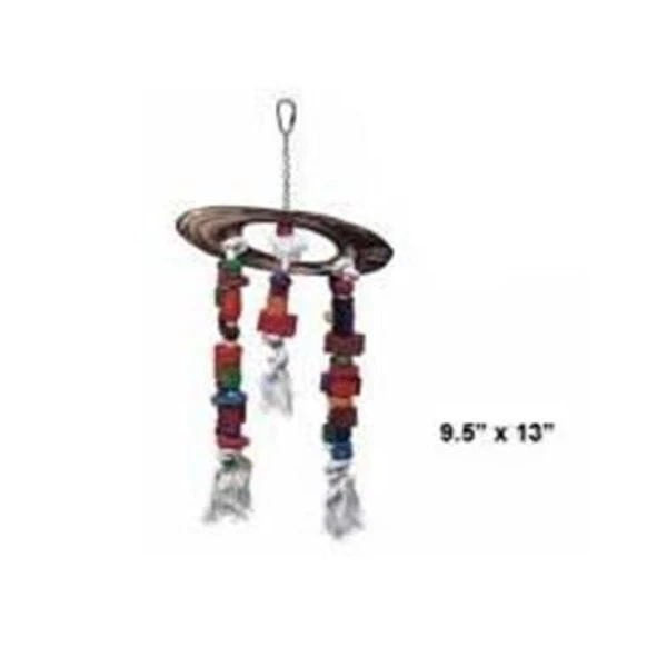 Halo is made of wood with thick cotton rope going through it. Along the all natural undye rope your bird will find wooden disk. balls. blocks. and spools. Size: 9.5" x 13".Ideal for medium to large bird.Economy Bird Toy.Variety of Shapes and Colors.