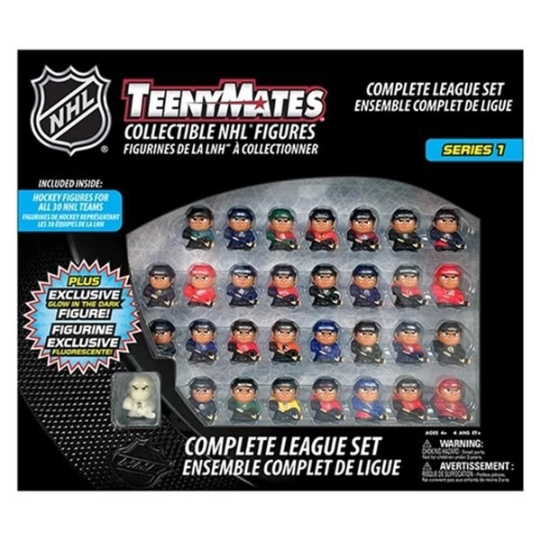 TeenyMates NHL Complete Gift Set Teeny Mates are 1" collectible figures of your favorite sports teams. Own all Series 1 NHL Teeny Mates in one complete gift set! The set includes 1" hockey player figures of all 30 NHL teams and an exclusive glow-in-the-dark figure. Cut out the printed hockey rink on the back of the box to use as a playset or to display your collection.