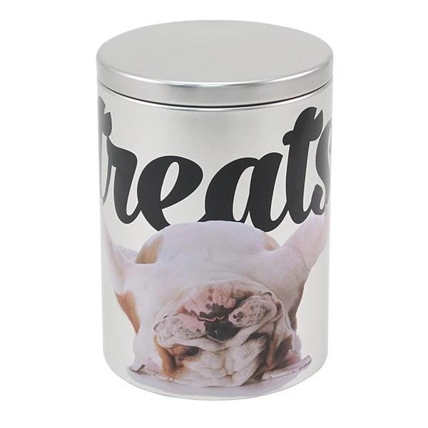 The Paw Prints Large Treat Tin is a vintage-inspired treat container that is cute enough to keep on the counter! Features exclusive Macbeth Collection design. Tight lid keeps treats fresh. Tin construction and BPA free. FeaturesDurable tin construction with fun Carlos the Bulldog designEasy to clean and stores neatly on a shelf or countertopAttractive way to store pet treats;; BPA FreeTight lid keeps food fresh and pests outUse to hold toys or other pet accessoriesSpecificationsSize: LargeDimensions: 5.25" L x 5.25" W x 7.5" HWeight: 1.27 lbs