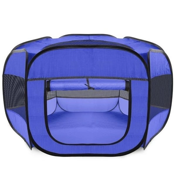 The portable pet playpen from Paws & Pals you can now provide your pet with the ultimate playtime experience. Perfect for dogs. cats. rabbits. guinea pigs. ferrets and even chickens! With a zippered doorway. this foldable playpen can be used as a home or playroom for your pets. The pop up pet playpen features a removable top for easy access and increased airflow. Its 8 panel design allows for an easy set up/take down as well as maximizes the space to fit more than one animal. Plus. the mesh windows provide a 360 degree view. so your pet can always be aware of their surroundings. Its intended for both indoor and outdoor use and is great for containing young pets. The zippered removable top is a great addition for outdoor use. as it provides shade from the sun as well as prevents hawks and other birds from swooping in and grabbing your puppies or kittens. Its portable design makes it a perfect choice for travel ideal for staying in a hotel or camping. It will also help protect your pet from flies. mosquitos. bees. other flying insects. and bugs & arachnids alike. FeaturesPortable Pet PlaypenConstructed from 600 D Nano-coated water resistant poly cloth. breathable mesh window shades. and reinforced with steel wiring.Easy To Use/Set Up:Just remove from storage bag and it will instantly spring to life. Plus. it's 100% hand washable.Great for use indoor or outdoor. even great for traveling.SpecificationsColor: Dark BlueWeight: 1.625 lbs