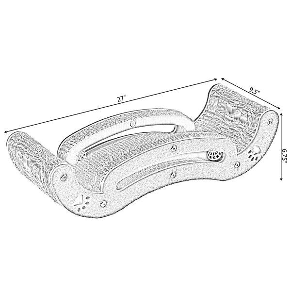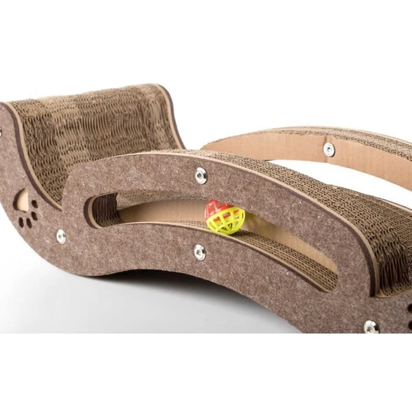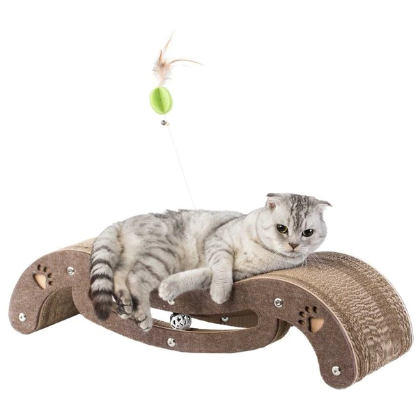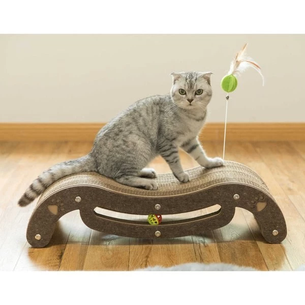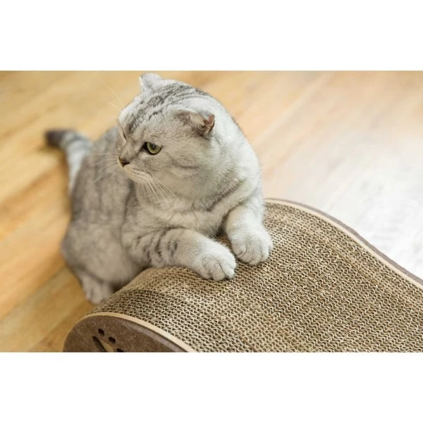 A cat lounge, scratcher, and interactive toy; cats will love this corrugated scratcher! Instinctive cat scratching makes for healthy paws, exercise, and relieves stress, increasing overall wellness. Made with corrugated cardboard, the cat scratched lounge features a modern design that will fit right in with your home décor. The lounge is designed to be reversible, so your cat can enjoy either a curved climbing surface or one with raised sides. The included cat feather and integrated ball toy will provide additional stimulation and exercise for your furry pal.
