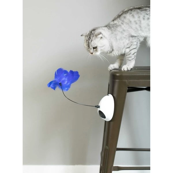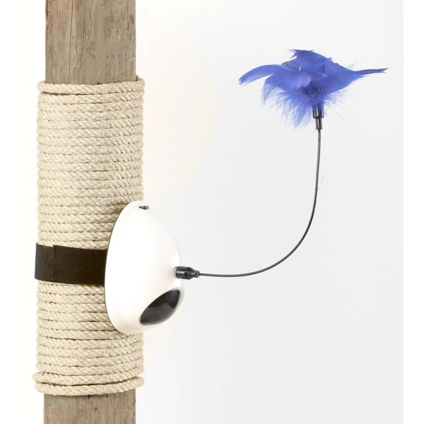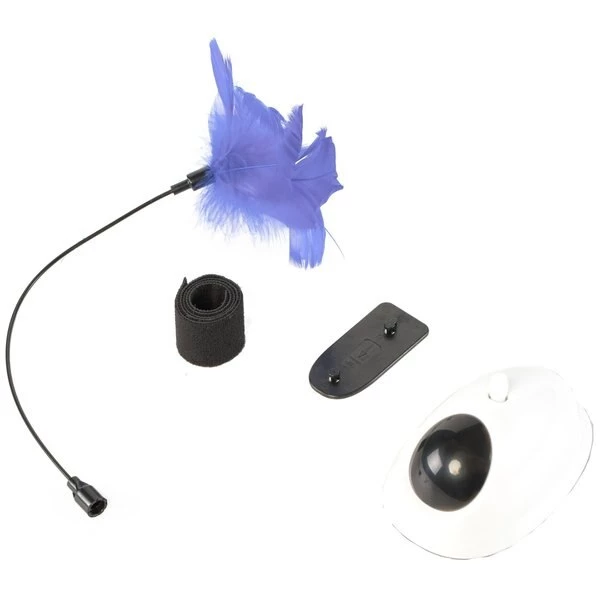 This interactive 2-in-1 cat toy will provide hours of play and exercise for your cat. Featuring both a hanging feather and laser-like light pointer, the toy will stimulate cats’ natural hunting instincts. The attached strap is easily attached to chairs, table legs, or other posts. Made with durable plastic, its designed to be both safe and withstand your cat’s chewing and scratching.