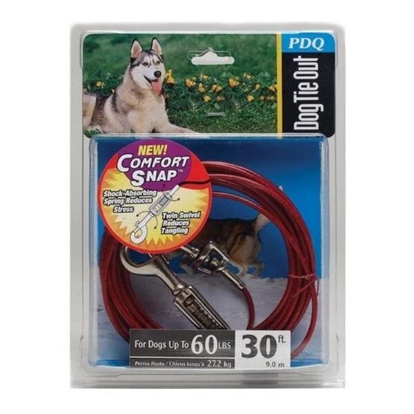 FeaturesMaterial: Vinyl Coated CableProduct Type: Tie OutLength: 3 ft. Load Limit: Up to 6 PoundsVinyl Coated: YesSize: LargeRope Configuration: SpringReflective: NoComfort snap springTwin swivel reduces stress