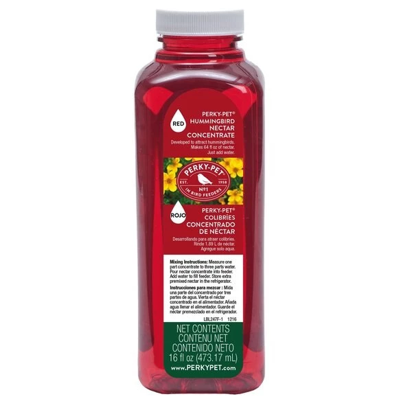 With such a high-energy lifestyle hummingbirds need to eat constantly. Perky-Pet Red Liquid Hummingbird Nectar Concentrate is made of 100% sucrose so your hummingbirds get just the essential energy they need to thrive. Hummingbirds easily digest sucrose so the energy is delivered faster than artificial nectar mixtures! This concentrate bottle makes feeding hummingbirds simple just add water to the concentrate to create your desired amount of nectar. The 16- ounce bottle makes up to 64 ounces of hummingbird nectar. ThereÆs no need to boil it and our nectar requires no refrigeration making storage a breeze! In addition this nectar features a bold red color that mimics the vibrantly colored flowers that hummingbirds imbibe from in nature. They wonÆt be able to resist stopping for a drink!
