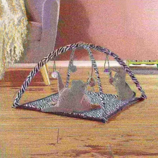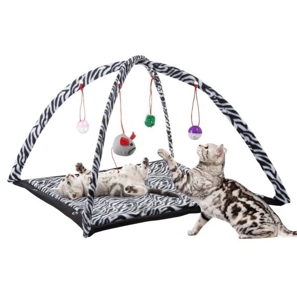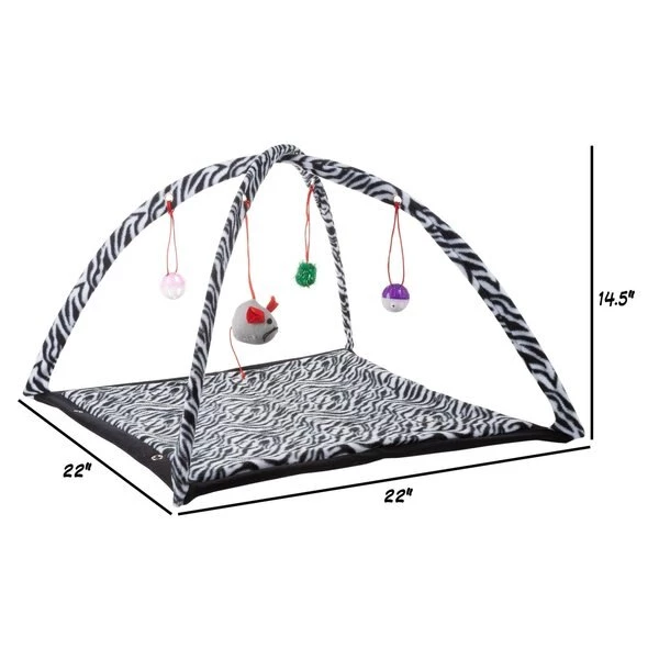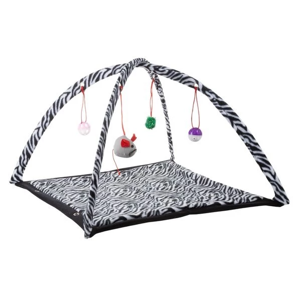 Keep your cat active and entertained with the Pet Adobe Interactive Activity Center. This fun interactive station was designed to not only entertain your feline friend, but also to help encourage physical activity, mental stimulation, and satisfy their senses and natural instincts. The four hanging toys are ideal for interactive play and help to entertain your cat, even when you are not home. It has a cozy, zebra print fleece mat as the base to provide cats and kittens with a peaceful lounging or napping area after playtime. The activity center features a -in pop up-in collapsible design, so it can conveniently fold down and pop up for storage and travel.