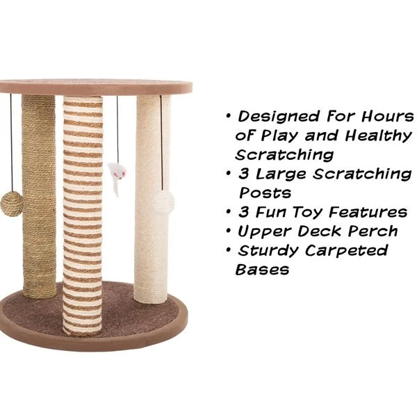 This Cat Scratching Post from Pet Adobe has 3 rope covered poles, 3 hanging toys and a perch pad – everything your indoor cat needs for playtime. Featuring a stable wooden base, soft carpet, and sisal rope, this easy to assemble vertical structure will keep multiple cats entertained and their claws off your furniture.