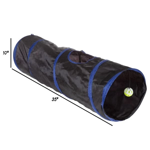 Keep your cat active and entertained with the Pet Adobe Interactive Play Tunnel. This toy was designed to not only entertain your four-legged friend, but also to help to encourage physical activity, mental stimulation, and satisfy your cats senses and natural instincts. The tunnel is ideal for interactive play and features a toy ball that hangs from the opening for your cat to play with and a peep hole for playing and spying. It is also perfect to provide cats and kittens with an enclosed space where they feel "safe-in for peaceful lounging and napping after playing in the tube. The tunnel is collapsible and lightweight, so it conveniently stores and is easily portable for travel. More than just a cat toy, this tunnel is also great for rabbits, small dogs, and other pets!