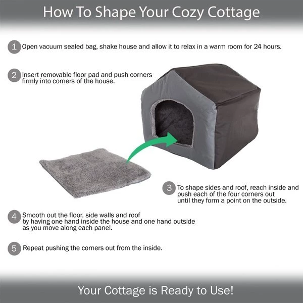 Pet Adobe cozy cottage house shaped pet bed provides a comfy and private space for your dog or cat. The soft sherpa lining provides a warm and comfortable space for your pet. The outside of the house as well as the bottom of the removable sherpa pad are covered in water resistant, easy to clean, canvas. This house is the perfect hideaway and resting spot for both cats or dogs.