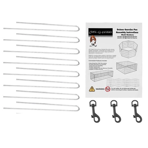 The Folding Metal Pet Playpen from Pet Adobe gives your animal extra space for exercise and helpful boundaries. This enclosure features eight 24×30-inch panels, a convenient door with a secure double latch, 3 locking hooks to connect the fencing and 8 ground stakes for use in the yard. Made of durable metal wire with a black satin finish, the sturdy playpen can hold its shape and will stand up to everyday use by non-climbing pets like a bunny, turtle, guinea pig, small dog, or puppy.