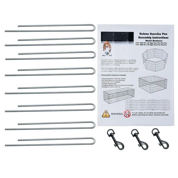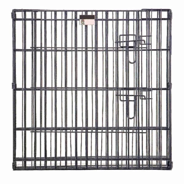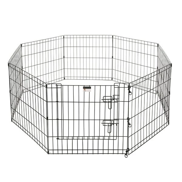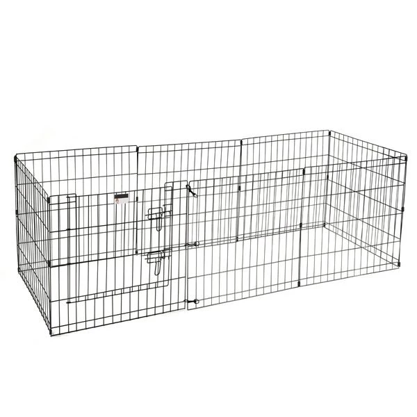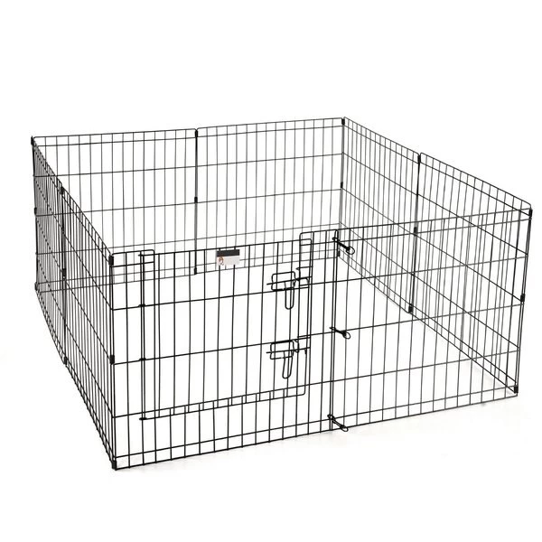 The 8 Panel Folding Metal Playpen from Pet Adobe gives your animal extra space for exercise and helpful boundaries. This enclosure features eight 24-inch wide by 24-inch tall panels, a convenient door with a secure double latch, 3 locking hooks to connect the fencing and 8 ground stakes for use in the yard. Made of durable metal wire with a black satin finish, the sturdy playpen can hold its shape and will stand up to everyday use by non-climbing pets like a bunny, turtle, guinea pig, small dog or puppy.