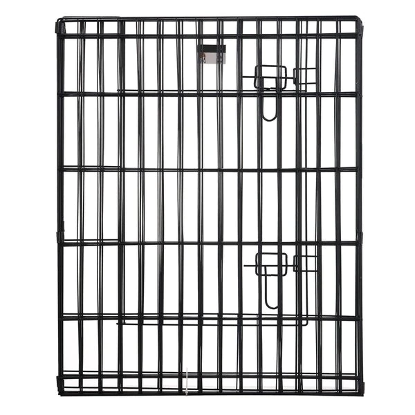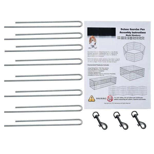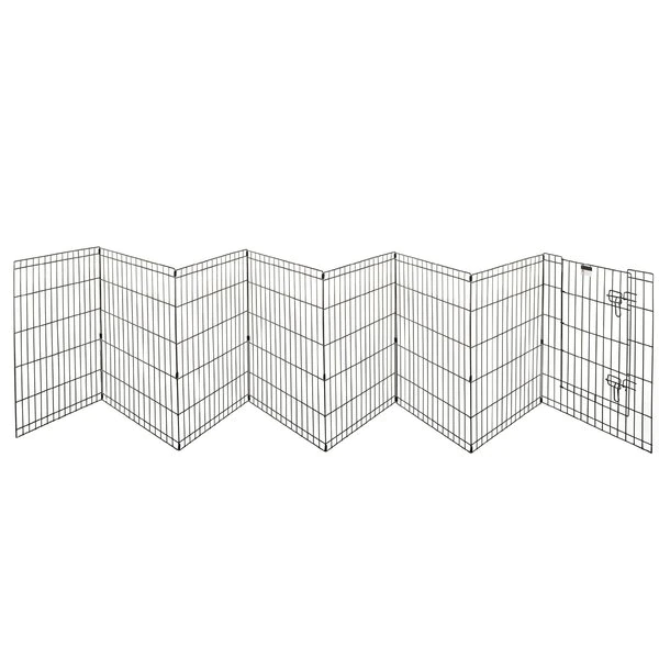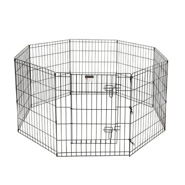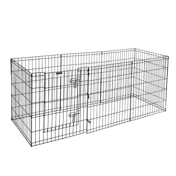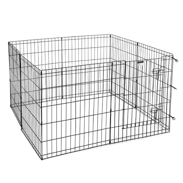 The Folding Metal Pet Playpen from Pet Adobe gives your animal extra space for exercise and helpful boundaries. This enclosure features eight, 24-inch wide by 30-inch tall panels, a convenient door with a secure double latch, 3 locking hooks to connect the fencing and 8 ground stakes for use in the yard. Made of durable metal wire with a black satin finish, the sturdy playpen can hold its shape and will stand up to everyday use by non-climbing pets like a bunny, turtle, guinea pig, small dog or puppy.