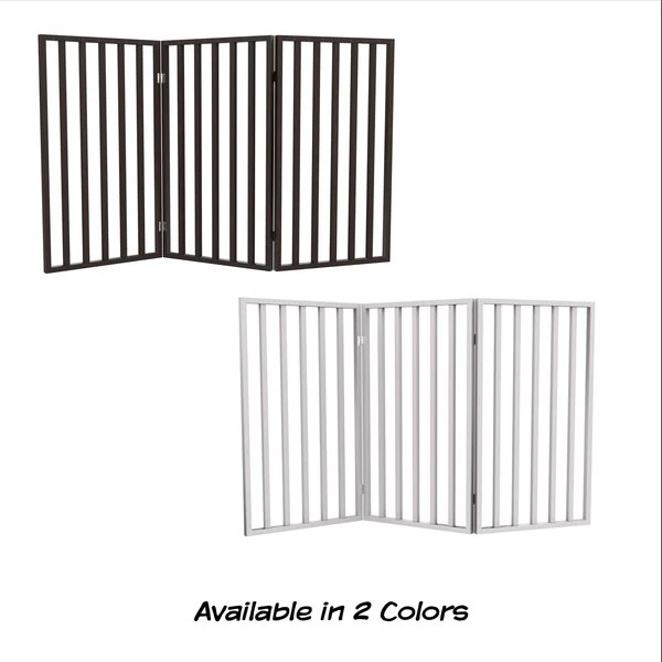The Freestanding 3 Panel Folding Pet Gate from Pet Adobe is a safe and efficient way to confine your pets while offering a decorative touch to your home decor. The accordion style three panel wood barrier is 54-inches long to accommodate most doorways, thresholds, hallways, and staircases without marking walls or drilling holes. Connected with strong metal hinges, the pet gate folds down to 3-inches wide for compact storage.
