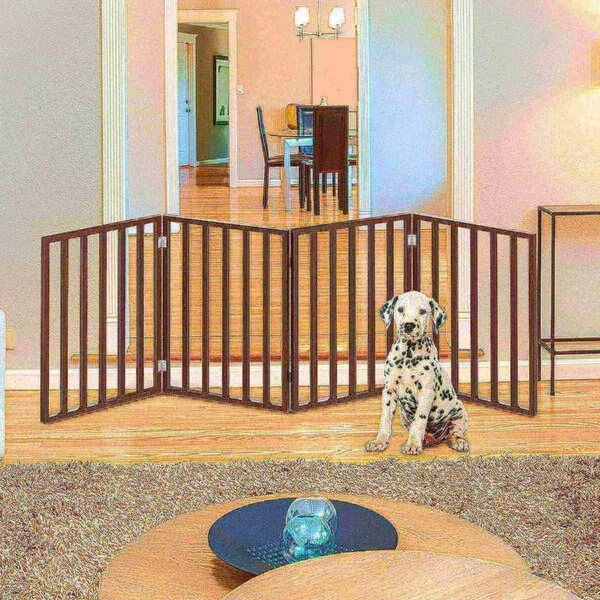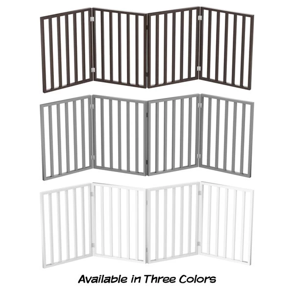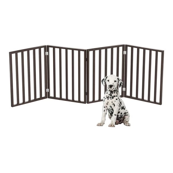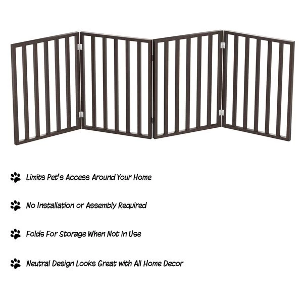 The Freestanding 4 Panel Folding Pet Gate from Pet Adobe is a safe and efficient way to confine your pets while offering a decorative touch to your home decor. The accordion style four panel wood barrier is 72-inches long to accommodate most doorways, thresholds, hallways, and staircases without marking walls or drilling holes. Connected with strong metal hinges, the pet gate folds down to 4-inches wide for compact storage.