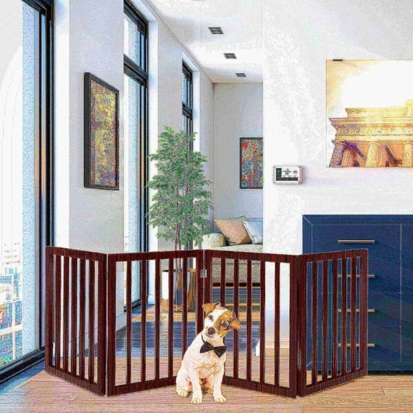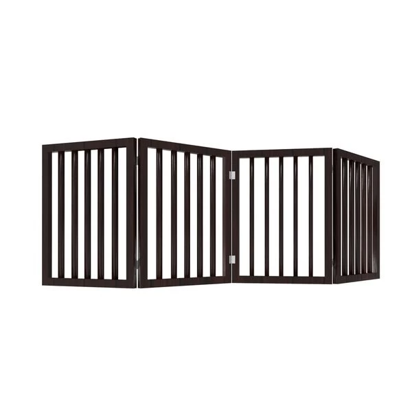 The Freestanding 4 Panel Folding Pet Gate from Pet Adobe is a safe and efficient way to confine your pets while offering a decorative touch to your home decor. The accordion style four panel wood barrier is 73-inches long to accommodate most doorways, thresholds, hallways, and staircases without marking walls or drilling holes.