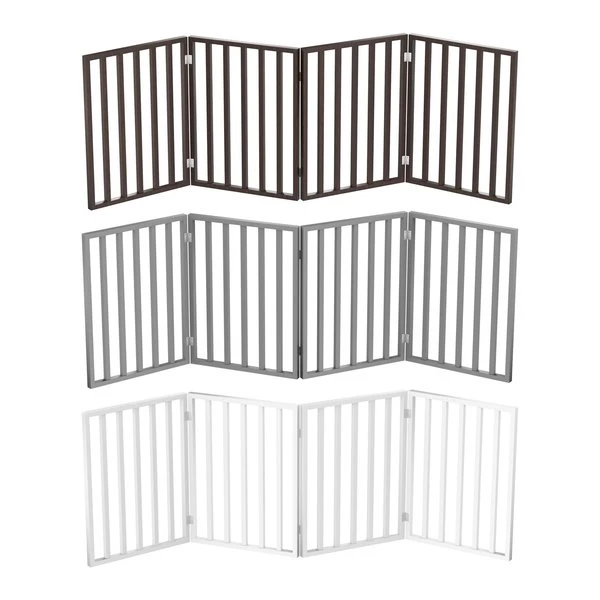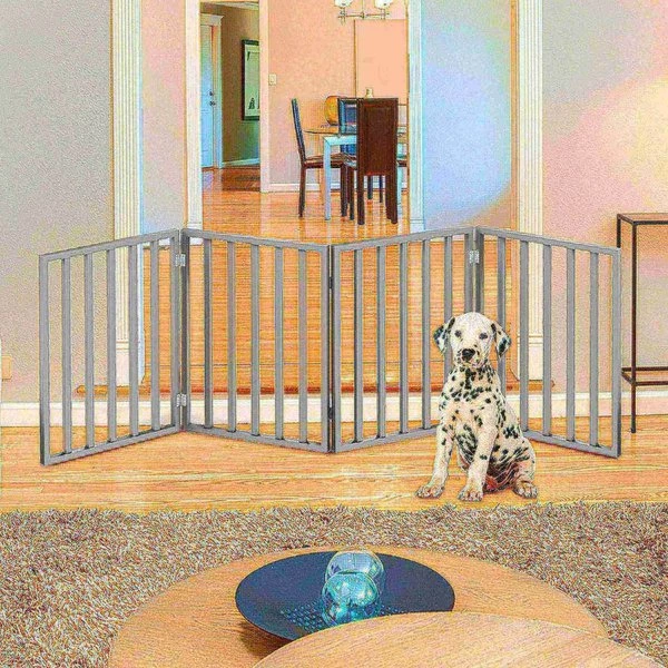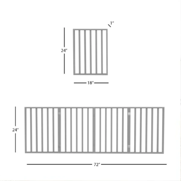 The Freestanding 4 Panel Folding Pet Gate from Pet Adobe is a safe and efficient way to confine your pets while offering a decorative touch to your home decor. The accordion style three panel wood barrier is 72-ines long to accommodate most doorways, thresholds, hallways, and staircases without marking walls or drilling holes. Connected with strong metal hinges, the pet gate folds down for compact storage.