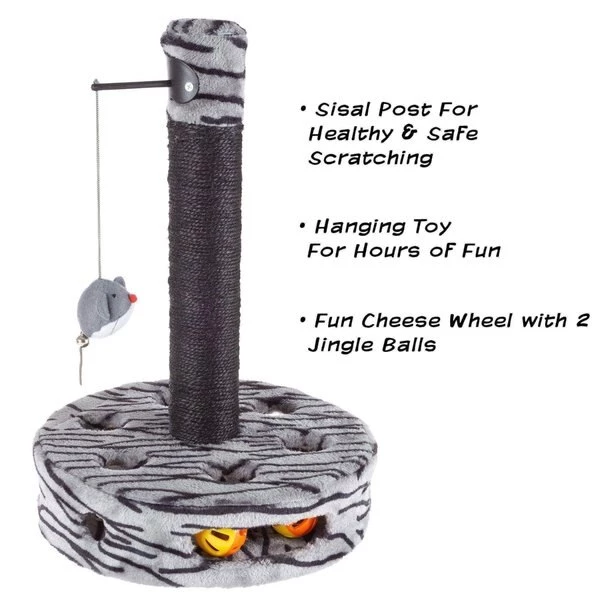 Keep your cat active and entertained with the Interactive Cat Scratching Post by Pet Adobe. This interactive cat tree features a carpeted base, a sisal fabric scratching post, a dangling mouse toy and a rolling ball track that gives your cat the thrill of the hunting while indoors. The neutral color scheme of the kitty condo will complement your home decor and its compact design will fit in any size room. This all-in-one cat scratcher and play area deters your pet from using your furniture to sharpen and trim their nails by providing hours of stimulating play that will leave them ready for a cat nap!