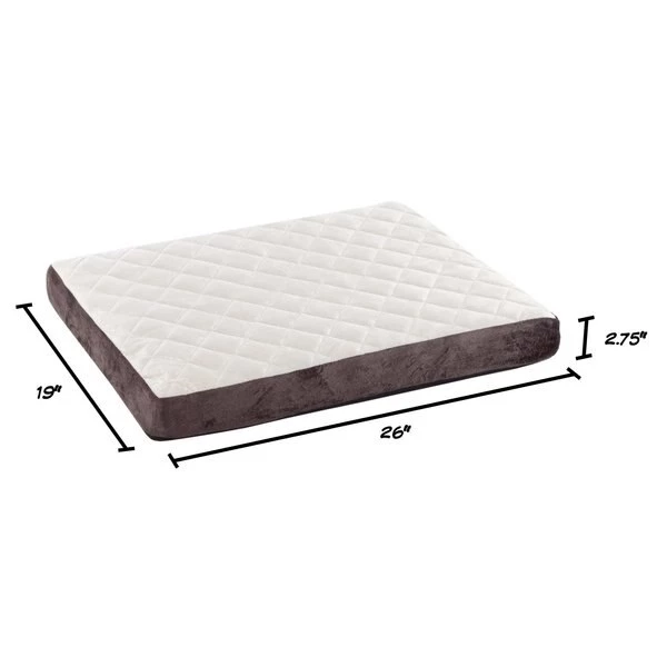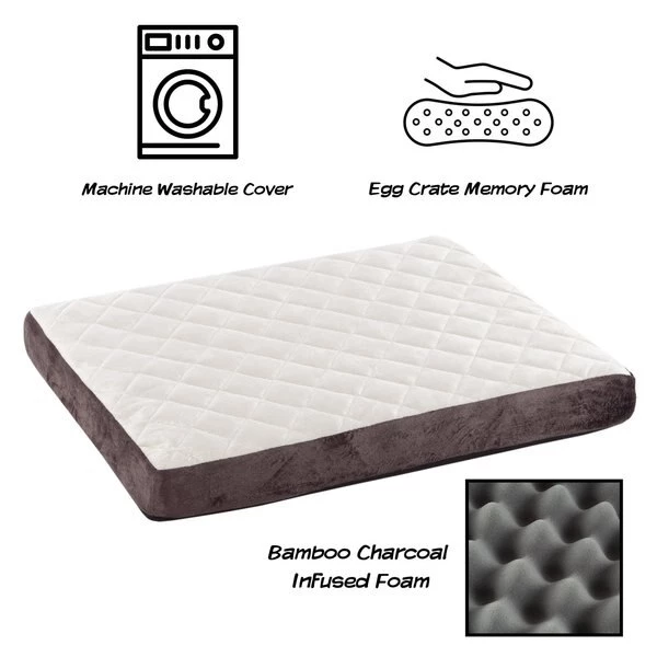 Give your pets ultimate comfort and support with the Charcoal Infused Foam Pet Bed by Pet Adobe. This pet bed cushion is made of 2.75-inch thick high density foam that is infused with bamboo charcoal to resist odor and mildew. The foam has an egg crate design to evenly distribute your pet's weight and is great for older pets with arthrIt's or muscle stiffness. The cover is plush polyester with a quilted top for extra comfort and a nonslip, water resistant bottom to keep it dry and stable. The cover is designed to complement your home decor. The cover also has a zipper for easy removal and can be machine washed for convenient care.