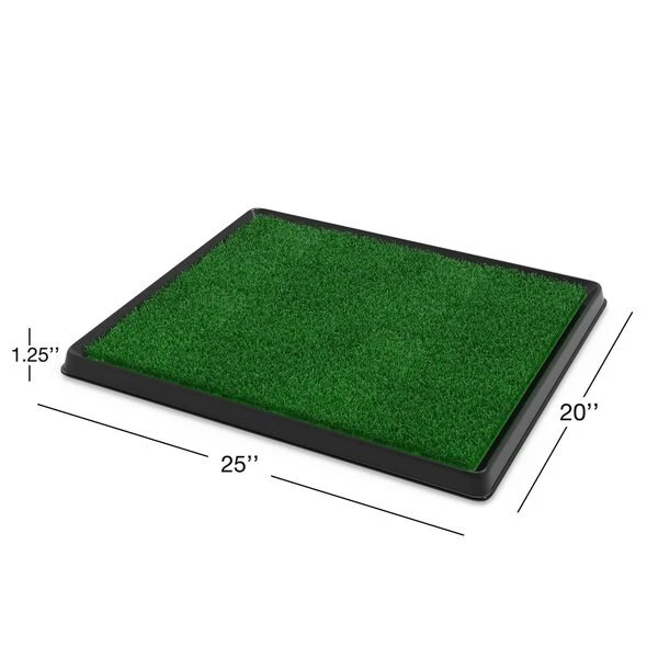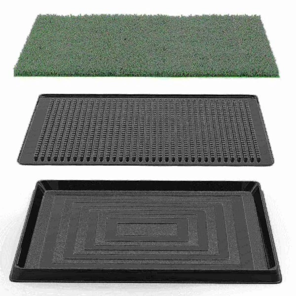 The Pet Adobe Puppy Artificial Grass Potty Training Mat helps avoid stained carpets, soiled furniture, and messes in your home, balcony, porch, patio, sunroom, hotel rooms, in RV's, or at the office. The synthetic carpet rug sits on top of an antimicrobial insert that collects the liquid and makes for easy cleanup. The third layer to the system is the base tray that the first two layers sit inside and keeps the mat in its place while your pet relieves themselves.
