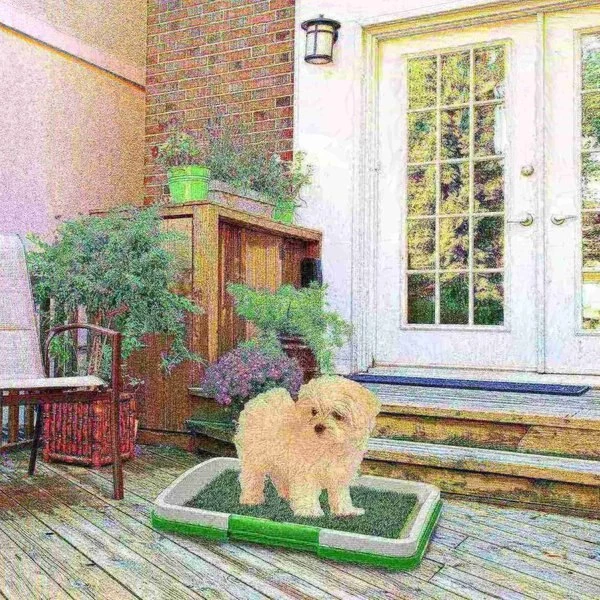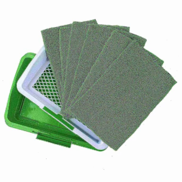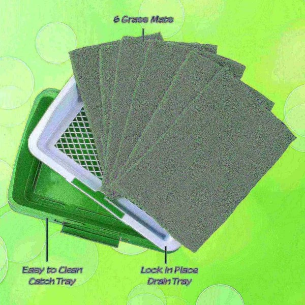 The Pet Adobe Puppy Artificial Grass Potty Training Mat Set helps avoid stained carpets, soiled furniture, and messes in your home, balcony, porch, patio, sunroom, hotel rooms, in RV's, or at the office. The synthetic carpet rug sits on top of an antimicrobial insert that collects the liquid and makes for easy cleanup. The third layer to the system is the base tray that the first two layers sit inside and keeps the mat in its place while your pet relieves themselves.
